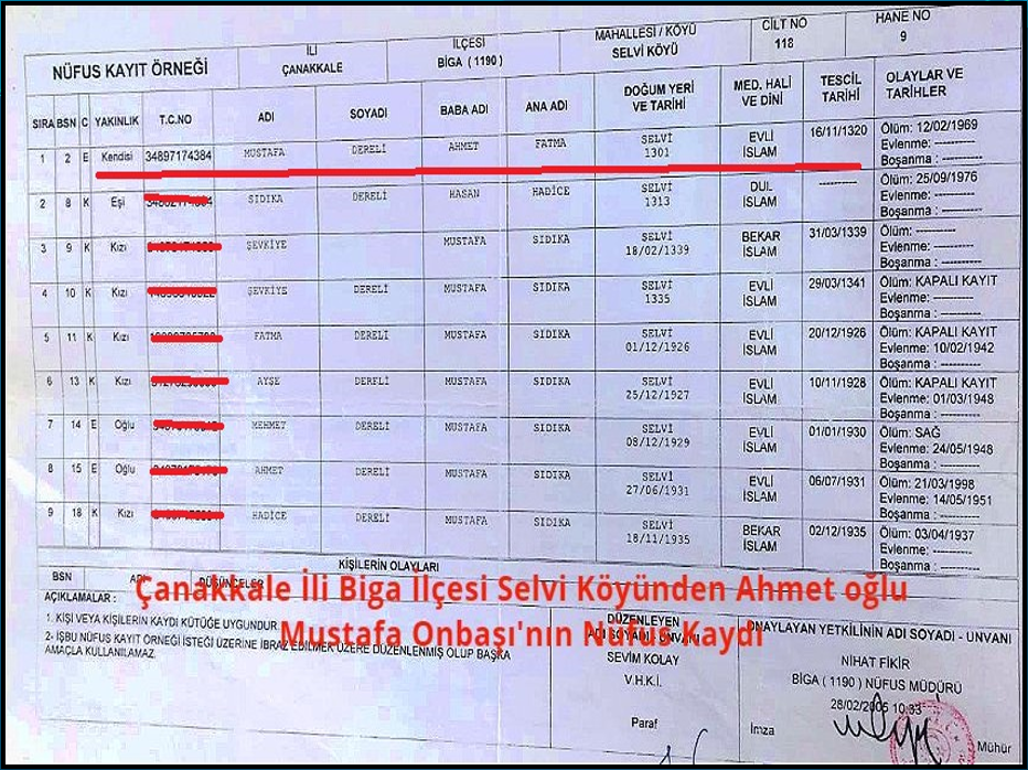 Resmi tarihe, kimlik bilgileri bu kadar detaylı girilen bu kahramanların izlerini sürerek Kütahya Gedizli Hasan Onbaşı ve Çanakkale Biga Selvi Köyünden Ahmet Oğlu Mustafa Onbaşının nüfus kimlik belgelerine ulaştım.