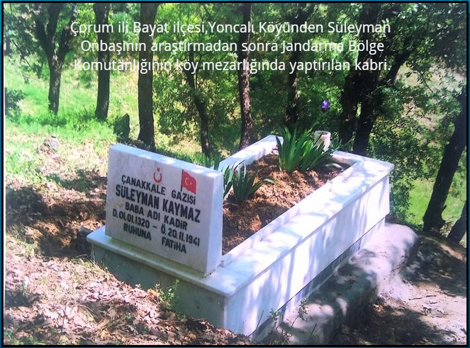 Çorum İskilipli Kadiroğlu Süleyman Onbaşı’ya ulaşmam, ilçenin adı değişerek Bayat, köyünün ise Yoncalı olması zamanımı almıştı. Burada görev yapan Jandarma Komutanlarından Metin Annadinç’in çabalarıyla Süleyman Onbaşı’nın kimlik bilgilerine ve yakınlarına ulaştım.