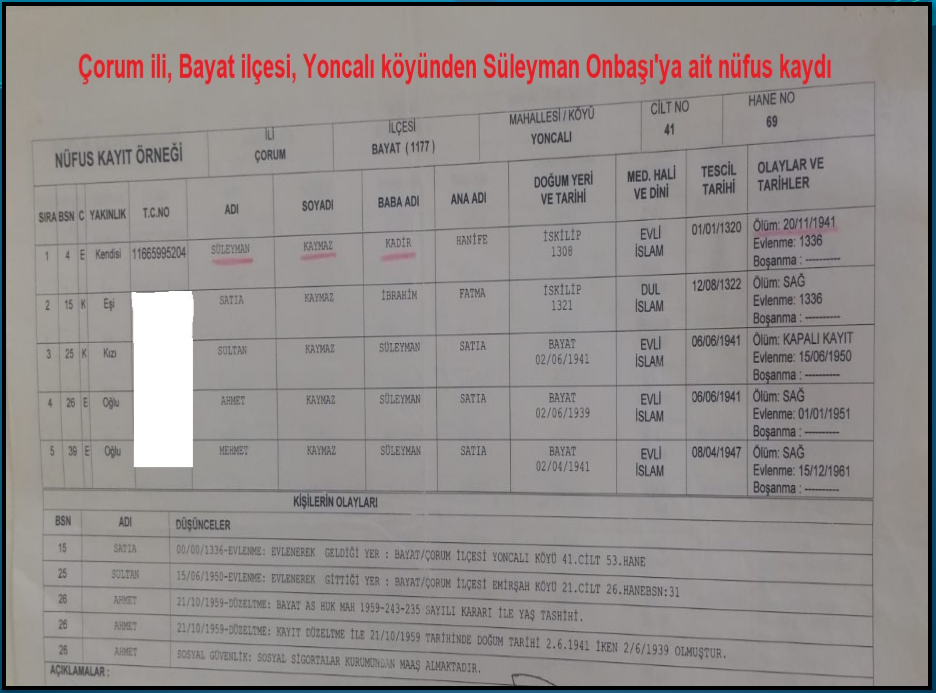 -Çorum, İskilip, Lape Köyü’nden (şimdiki adı Bayat İlçesi Yoncalı Köyü) Hatipoğulları’ndan Kadir oğlu Süleyman Onbaşı